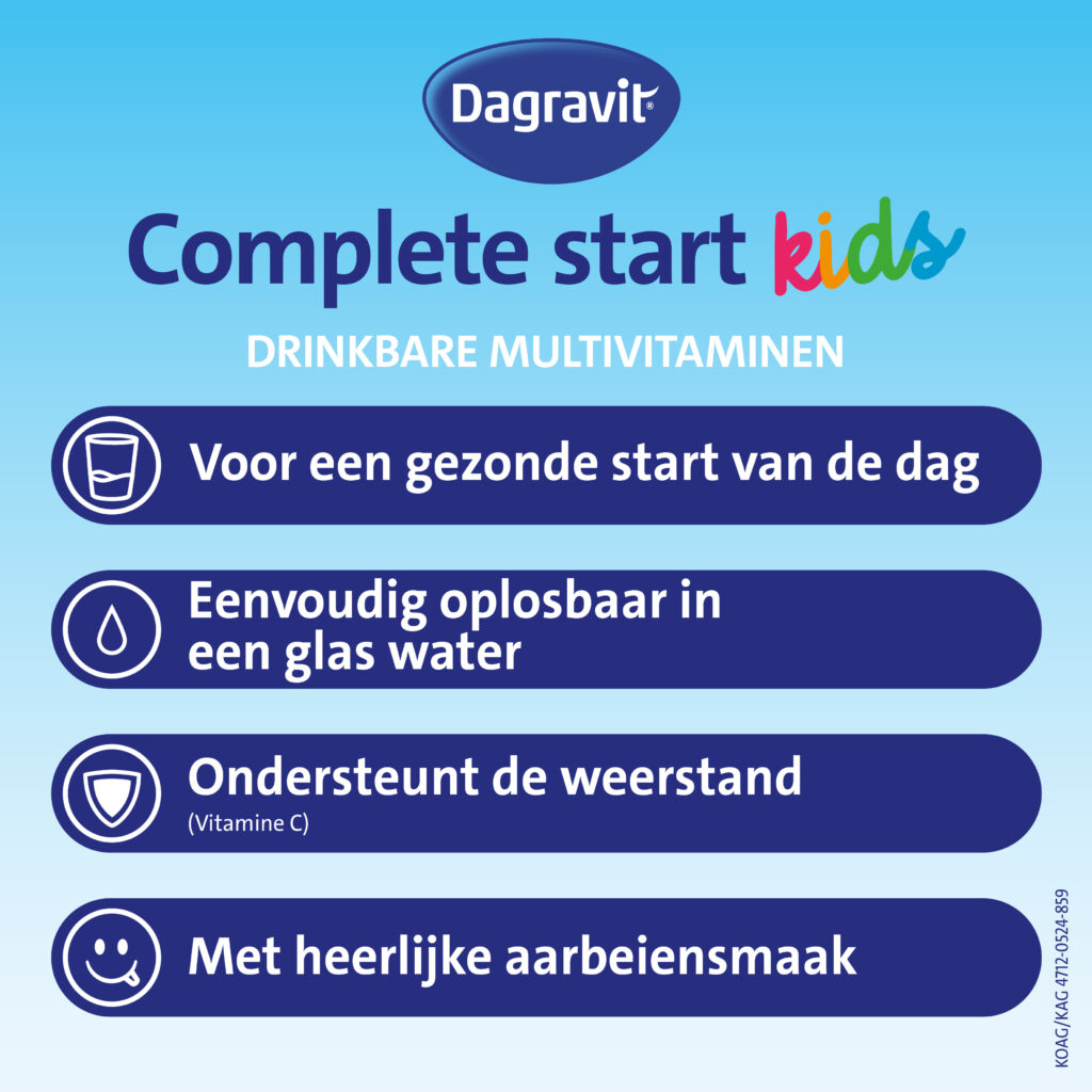 Start de dag goed met Dagravit Complete Start Kids drinkbare multivitaminen. Een zorgvuldig samengestelde mix van vitaminen en mineralen speciaal voor kinderen voor een gezonde start van de dag. Eenvoudig oplosbaar in water en met een heerlijke aardbeien smaak. Zo starten jouw kids de dag goed met een gezond genietmomentje!