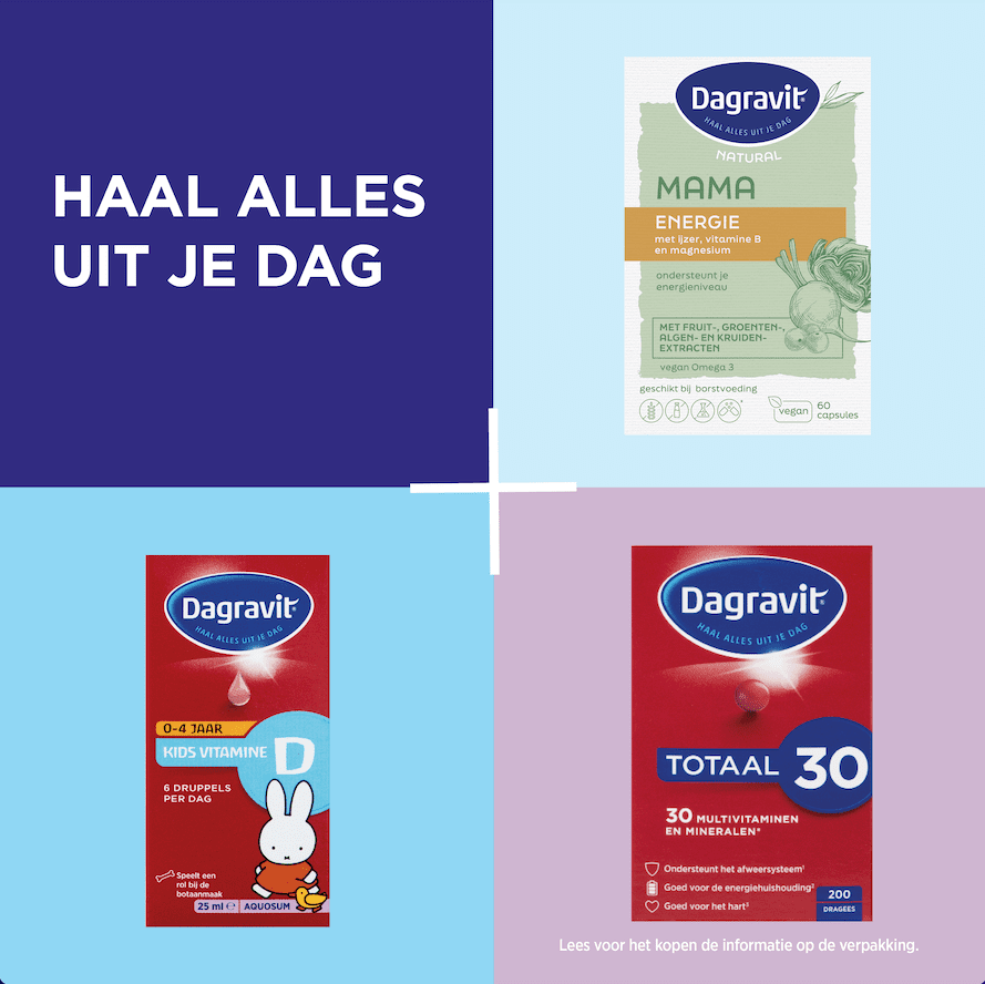 unieke mix van essentiële vitaminen en mineralen, speciaal afgestemd op moeders, met o.a. extra ijzer, vitamine D3 en een bron van vegan omega 3, gecombineerd met een speciale mix van fruit-, groenten-, algen- en kruidenextracten. Dagravit Mama Energie ondersteunt je op het gebied van energie en vitaliteit, ook als je borstvoeding geeft. Elke dag een extraatje als aanvulling op je voeding! Dagravit Mama Energie helpt je opnieuw fit te voelen.